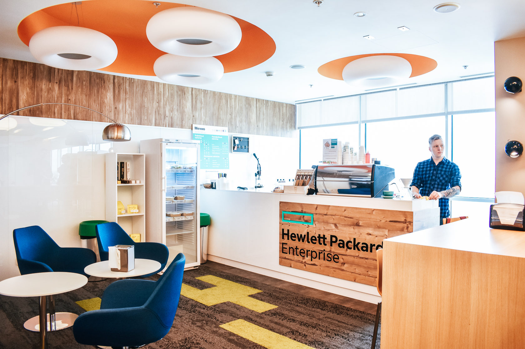 The Hewlett Packard Enterprise cafeteria has become more than just a place where employees can have a rest: the place has become a meeting point for the guests even from neighbouring offices of the business centre.